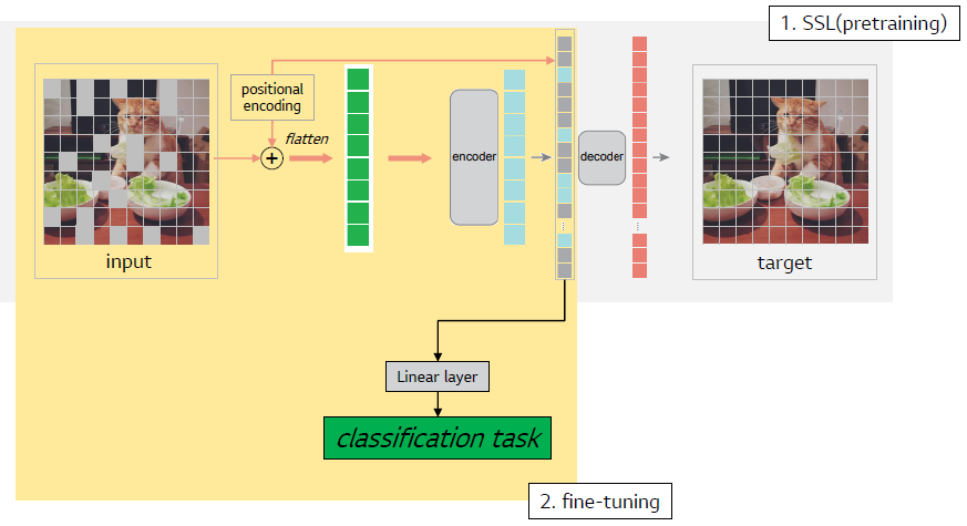 MAE는 masked patch를 복원하는 self-supervised learning을 통한 pretrain을 수행하고, 이를 pretrained weight로 initialize하여 원하는 target task 성능을 올리는 실험 세팅으로 유의미한 결과를 보여주었습니다.