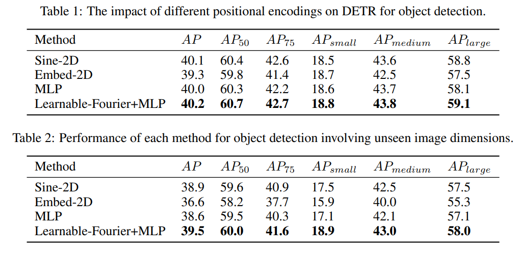 Object detection task에서 Transformer를 사용한 DETR 논문을 ①과 마찬가지로 positional encoding만 바꾸어 실험한 것입니다. 결과는