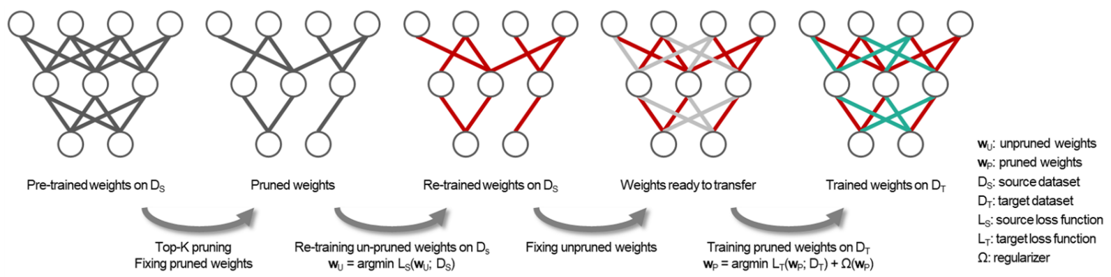 ③ However, parameter 과하면 task(본문에 source task라고 적혀있는데 굳이 inductive transfer learning 얘기가 아니어서 빼도 될듯) 학습했던거 accuracy 손실 없이 model을 prune(가지치기)해낼 수 있다.