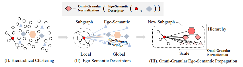 ⑧ 어떻게 하냐면 global structure와 local structure 사이의 first, second order feature difference를 쓰는 ego-semantic descriptor가 있는데, 이걸 여러개 만들어서 neighbor node로 씀으로써 local graph convolution을 계산할 때 반영된다.