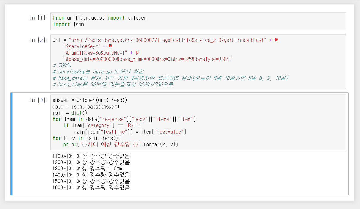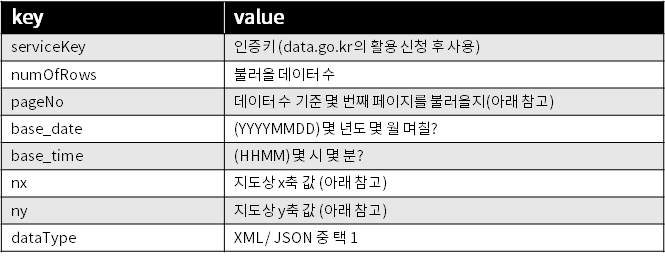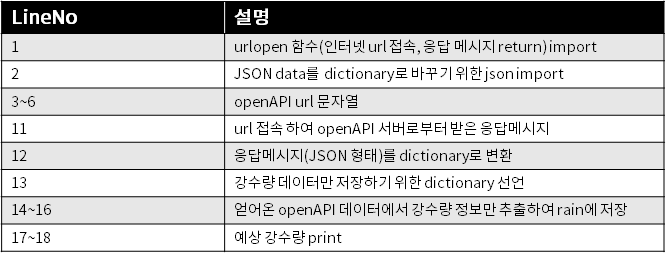 from urllib.request import urlopen import json url = "http://apis.data.go.kr/1360000/VilageFcstInfoService_2.0/getUltraSrtFcst" + \ "?serviceKey=???" + \ "&numOfRows=60&pageNo=1" + \ "&base_date=20200000&base_time=0030&nx=61&ny=125&dataType=JSON" # TODO: # serviceKey는 data.go.kr에서 확인 # base_date는 현재 시각 기준 3일까지만 제공됨에 유의(오늘이 8월 10일이면 8월 8, 9, 10일) # base_time은 30분에 리뉴얼돼서 0030~2330으로 answer = urlopen(url).read() data = json.loads(answer) rain = dict() for item in data["response"]["body"]["items"]["item"]: if item["category"] == "RN1": rain[item["fcstTime"]] = item["fcstValue"] for k, v in rain.items(): print("{}시에 예상 강수량 {}".format(k, v))아래 표는 위 코드에 대한 설명입니다.