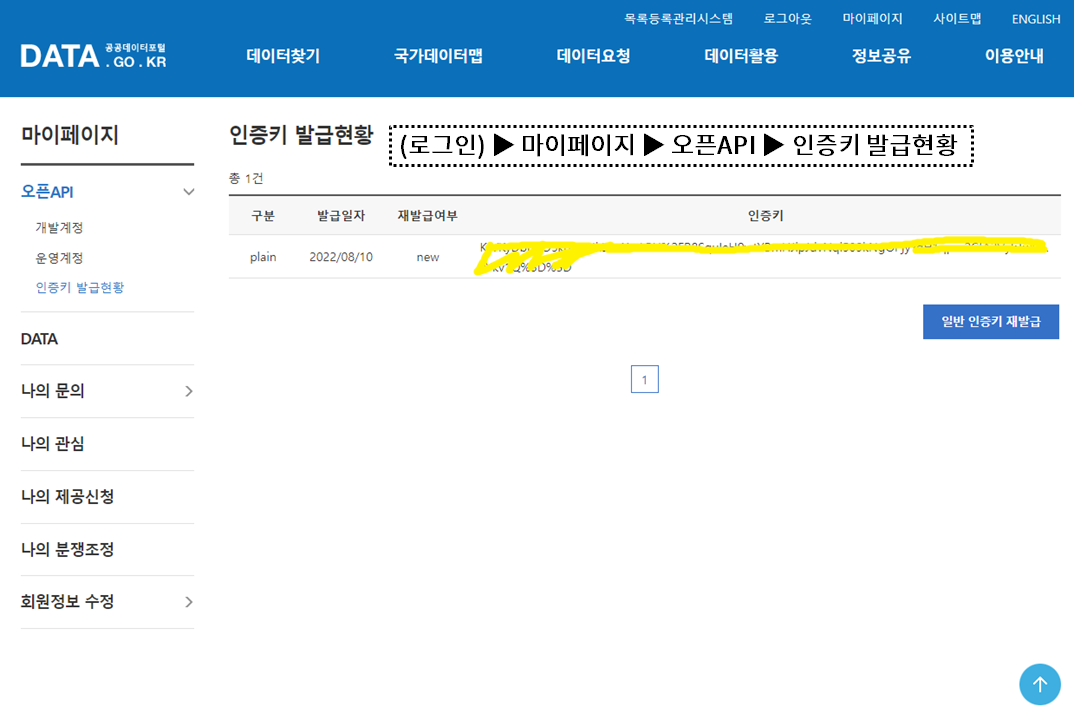 인증키 확인 위 그림에서 가려놓은 인증키를 잠시 후 openAPI 접근 때 사용합니다.