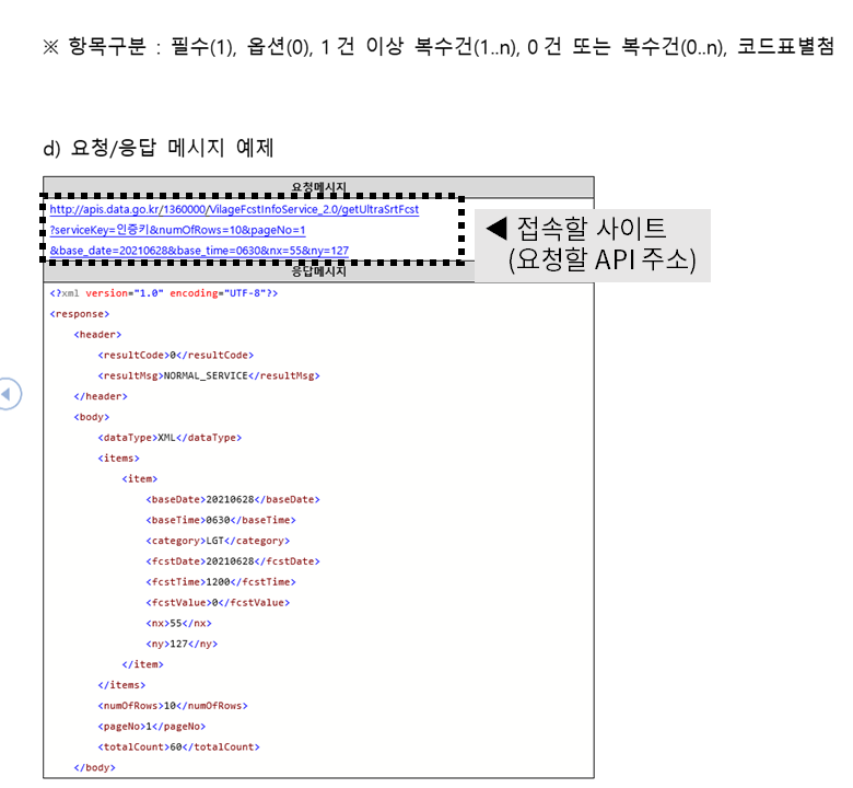 openAPI 활용 가이드 위 요청메시지에서 각 항목의 뜻은 아래 표에서 확인할 수 있습니다.