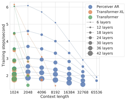 모두 TPUv4 한대에서 batch-size 1로 진행한 결과이고, 모델의 사이즈가 커질수록, training 속도가 감소하지만, Perceiver AR이 긴 length sample에 대한 학습에서 더 빠른 것을 확인하실 수 있습니다.