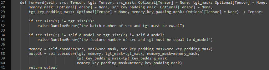 [optional2]padding이 붙지 않은 mask는 주로 NLP분야에서 word 단위의 embedding을 거칠 때 unknown token으로 처리된 sample에 대해서 unknown token에 attention 가중치가 가지 않도록 하기 위해 사용되는 mask sequence이며, 그렇기 때문에 불규칙적으로 False, True가 나타나게 됩니다(unknown token이 있는 sample index에서 True).[/optional2]31~32 입력된 src와 tgt의 Batch size가 같지 않다면 에러를 발생시킵니다. 34~35 입력된 src와 tgt의 sequence sample당 dimension이 d_model과 같지 않은 경우 에러를 발생시킵니다. [optional] __init__()에서 self.d_model을 따로 저장해둔 이유가 여기 있습니다. 만일 self.d_model을 따로 선언해두지 않았을 경우에는 Transformer model의 matrix의 weight를 복잡한 함수를 사용하여 호출해야 하였을 것이고, 코드가 복잡해졌을 것입니다. [/optional] 37 Transformer Encoder 계산을 수행합니다. 모델 그림에서 왼쪽 큰 사각형 부분의 계산을 수행합니다.