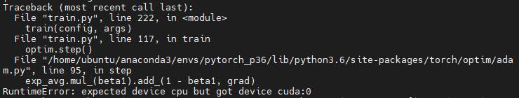 device가 "cuda" device로 설정되어있을시, optim의 state마다 cuda에 올려줍니다. model은 GPU에 올라가있지만 optimizer의 state가 올라가있지 않기 때문에 optimizer는 cpu tensor가 오길 바라지만 cuda tensor가 오게 되어 위와같은 에러를 발생시킵니다.위와 같이 optimizer state를 gpu로 올려주면 더이상 optimizer.step()에서 에러가 발생하지 않습니다.